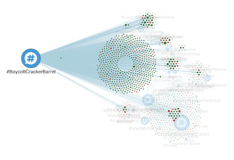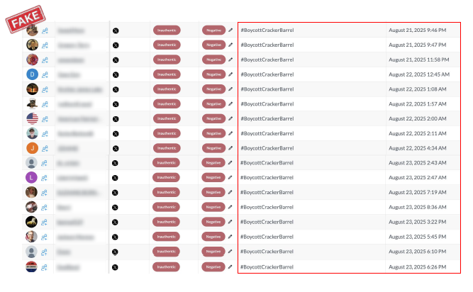 - 21% of profiles were fake: more than one-fifth of the profiles in the conversation were identified as inauthentic accounts, and were actively attacking Cracker Barrel using the hashtags #BoycottCrackerBarrel, #CrackerBarrelHasFallen, #CrackerBarrelCEO, and #CrackerBarrelIsFinished.