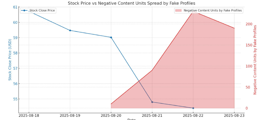Cyabra’s analysis shows a direct correlation between the surge in fake profile activity and the stock’s decline, with the most intense period of negative posting occurring precisely when the stock experienced its steepest drop.