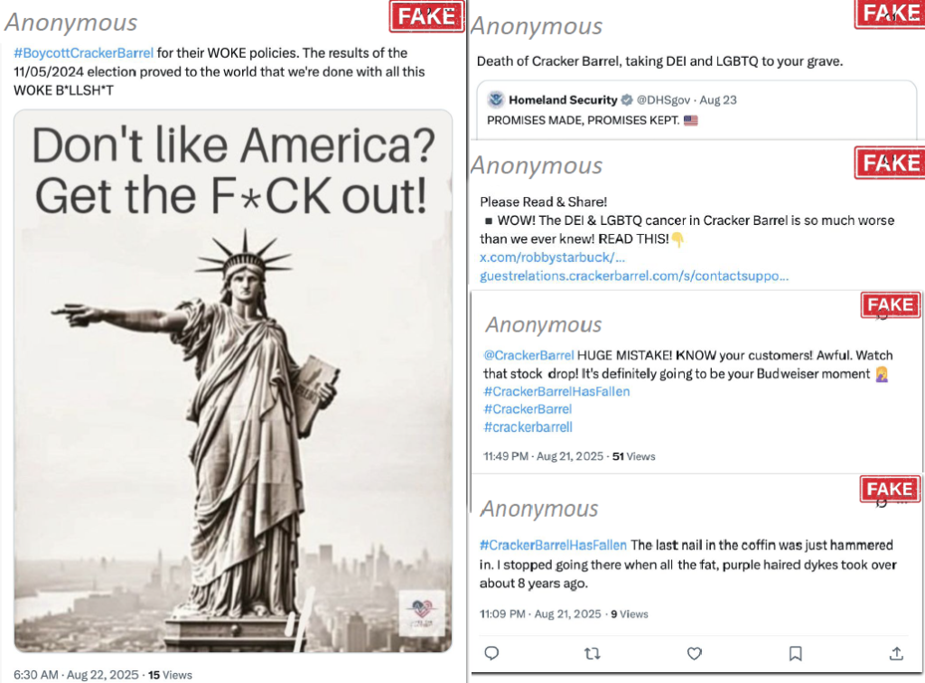 Fake profiles portrayed Cracker Barrel’s rebranding as a rejection of its core audience and an embrace of “woke” politics. These accounts claimed the company was “erasing nostalgia and heritage” by removing the iconic barrel figure. Messages consistently accused the company of surrendering to a “woke agenda” instead of preserving traditional American heritage. Many fake accounts specifically compared the situation to Bud Light’s controversial 2023 campaign.