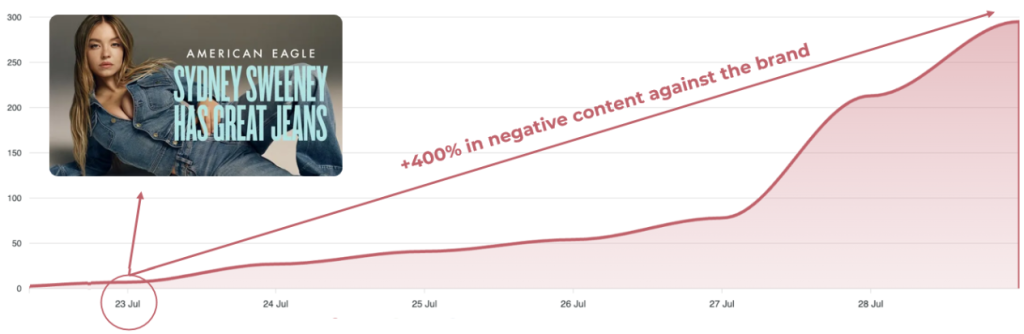 - Within a week of launch, American Eagle’s 2025 ad campaign suffered a 4,000% increase in negative sentiment, fuelled by 2.7 million engagements and 881 million potential views.