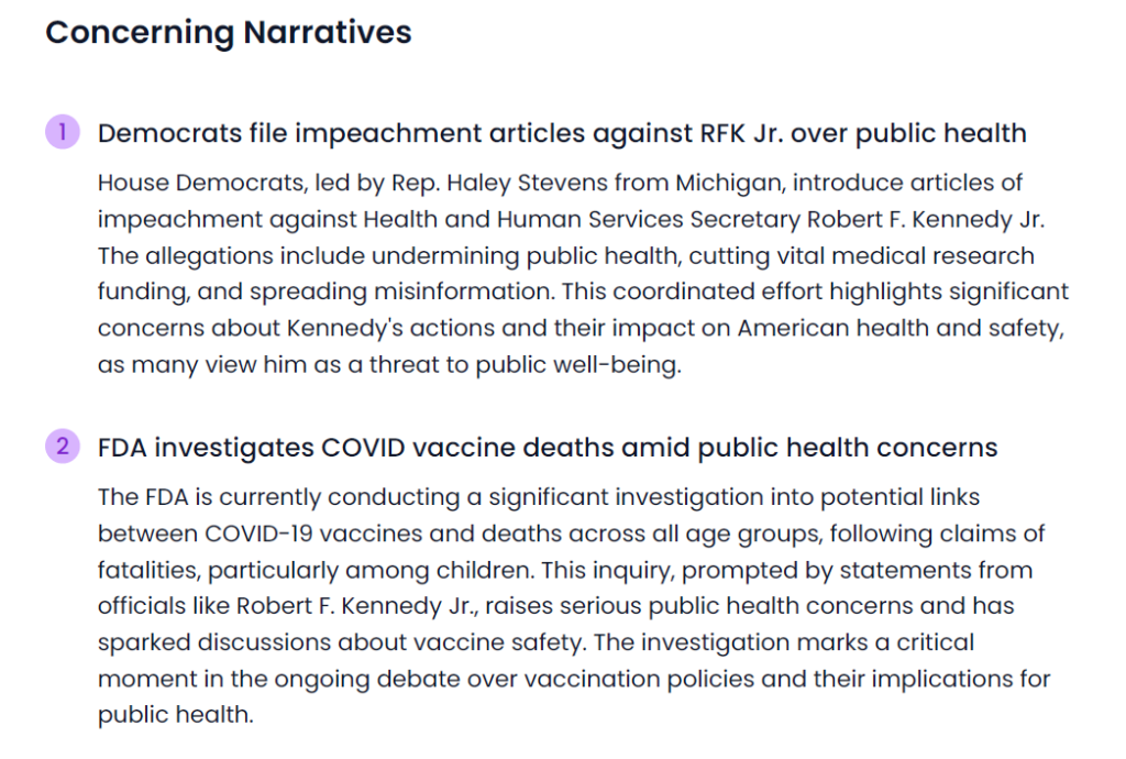 - For governments and public agencies: Narrative Alerts bring clarity to complex online information environments: tracking emerging influence operations, election interference, propaganda, and extremism across all platforms and languages. It strengthens institutional resilience by uncovering the actors and communities driving coordinated disinformation before it undermines public trust.