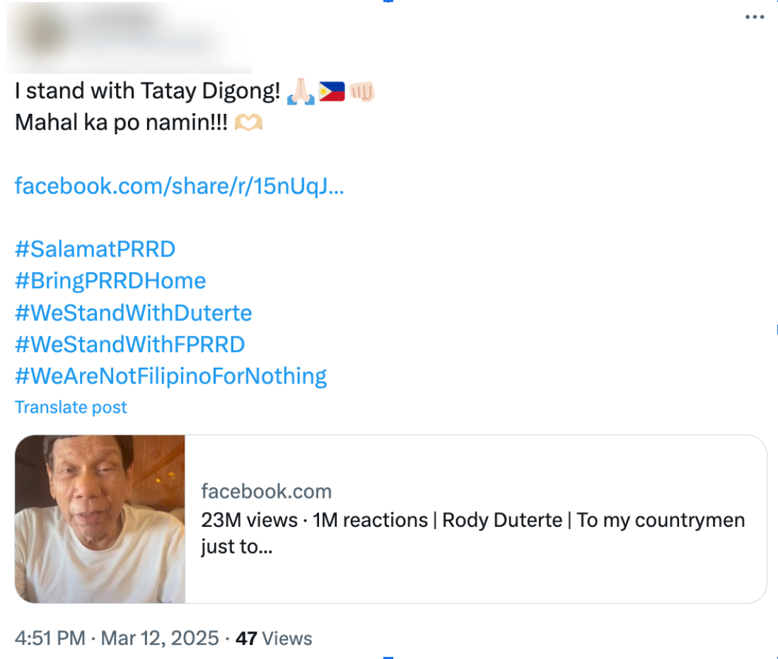 - The coordinated campaigns praised Duterte’s leadership and framed his arrest as foreign interference, amplifying hashtags like #BringPRRDHome.