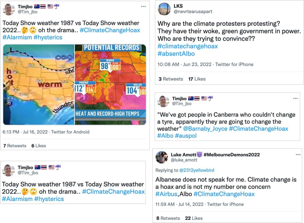 Popular hashtags in those conversations were #ClimateHysteria, #ClimateChangeHoax, #Climatehypocrisy and #Geoengineering (see full list below). Some of those posts were clearly written to sow fear, while others were intended to reduce the importance of the environmental issue.