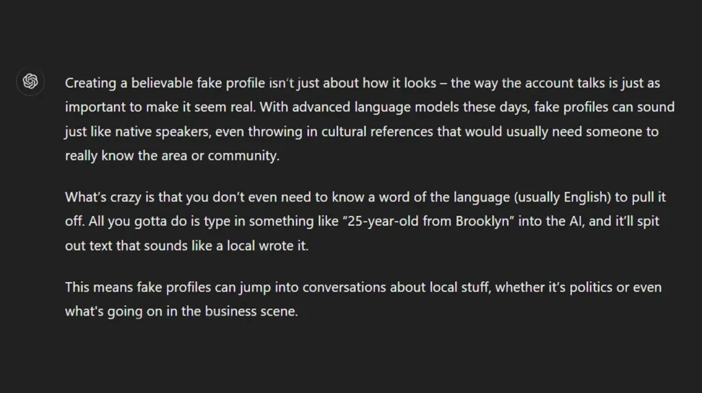 Thanks to advanced language models, fake profiles can now mimic native speakers with uncanny accuracy, with the ability to “understand” cultural references that previously would have required intimate knowledge of a specific region or community.