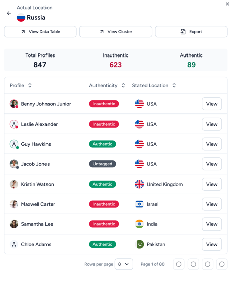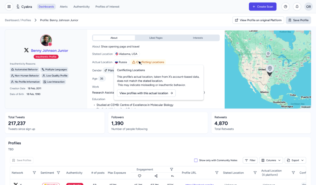 Cyabra’s new feature makes location deception visible at scale. Conflicting Locations compares the location stated by profiles against account-based geolocation data, instantly flagging discrepancies that may indicate coordinated activity, influence operations, or inauthentic behavior.