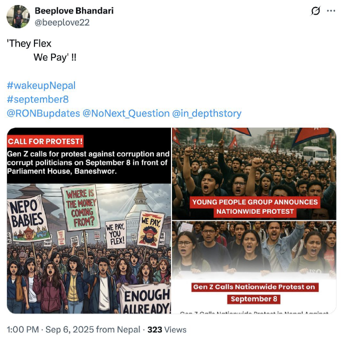 Calls for protest started spreading after the Nepali government declared a ban on social media platforms, supposedly to combat fake accounts, disinformation, and misinformation, which was not received well by Nepali citizens. On September 6–7, social media saw a surge of posts urging people to join the demonstrations, using hashtags such as #September8, #WakeUpNepal, and #GenZProtest. Many of these promotional posts featured AI-generated visuals of protesters, amplifying their appeal and reach. After September 8, when police opened fire on demonstrators near Parliament, leaving dozens dead in the first major clashes, the conversation shifted from mobilization to violence documentation, with users sharing images, videos, and testimonies of clashes.