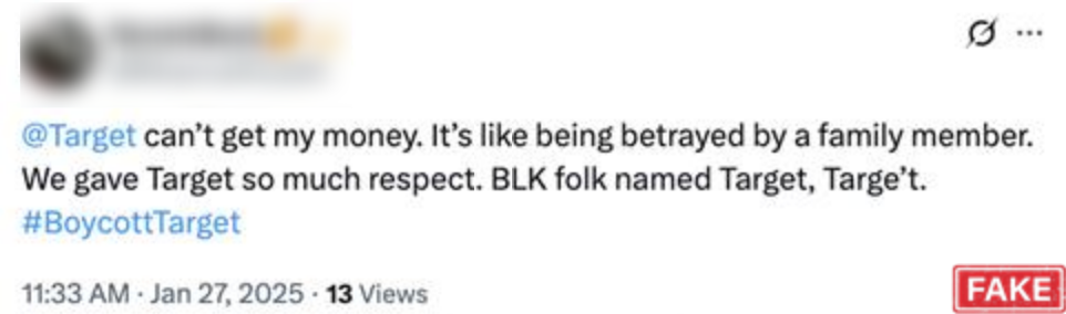 Many of these fake profiles posed as disillusioned black consumers, claiming Target’s decision was a betrayal and calling for economic retaliation. Posts urged a 40-day “Target Fast,” framed as a show of collective power, an effort that mirrored structured campaigns, not spontaneous consumer outrage. This movement was not a single incident: it came following a huge list of boycotts across the past six months, following the Economic Blackout boycotts.