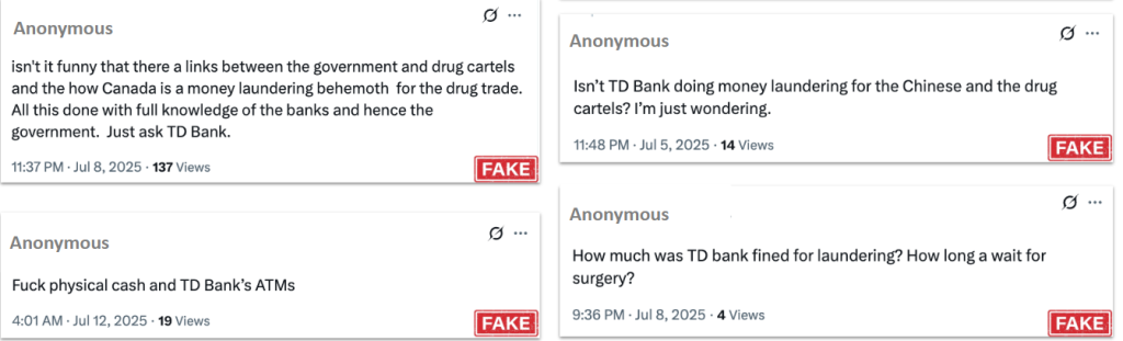 - Inauthentic accounts repeatedly portrayed the bank as untrustworthy, accusing it of money laundering, and warning the public against using TD Bank’s services