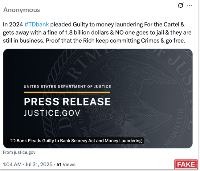 - Financial misconduct allegations: The most prominent narrative accused TD Bank of involvement in money laundering and financing criminal activity. Posts used emotional messaging while framing the bank as knowingly enabling these activities.
