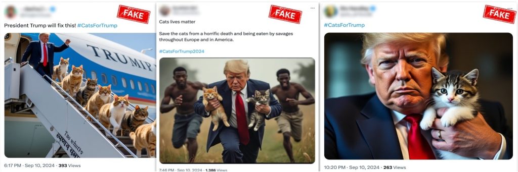 - Another false claim revolved around Trump’s accusation that Haitian immigrants were stealing and eating pets in Springfield, Ohio. While this conspiracy theory spread, a counter-campaign mocking it surfaced, sharing GenAI images of Trump rescuing cats. Although the campaign was satirical and not intended to appear authentic, it ironically contributed to the spread of the original false narrative.