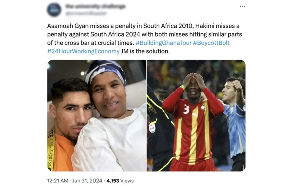 Even something as unrelated as a missed penalty can be linked to the boycott, as seen here where both incidents involved Ghana.