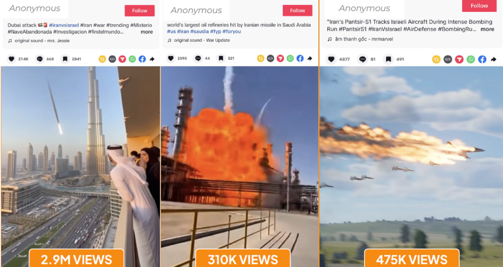 The first narrative portrayed Iran as successfully striking military targets across the region, including U.S. aircraft carriers, Israeli cities and military bases, the Burj Khalifa in Dubai, and Saudi oil refineries. Most of this content consisted of AI-generated deepfake videos depicting attacks that did not occur, or significantly exaggerating those that did. The most viral video from a single key account accumulated 2.9 million views on TikTok alone. Some videos included what appeared to be the original AI generation prompts in their captions, a technical artifact confirming they were synthetically produced.