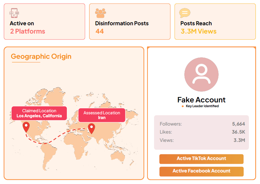 - 19% of accounts analyzed were inauthentic, amplifying AI-generated deepfakes and fabricated war footage at scale. TikTok was the source of 72% of total campaign views (over 105 million)