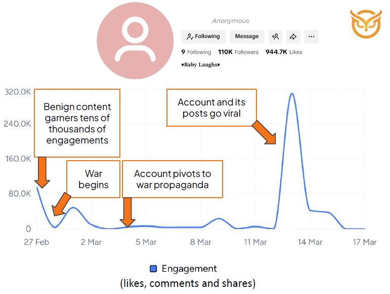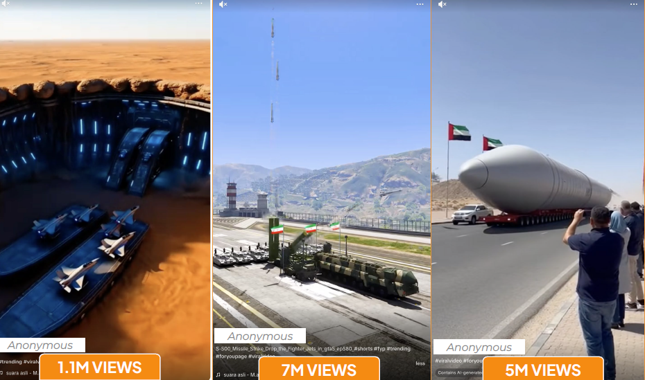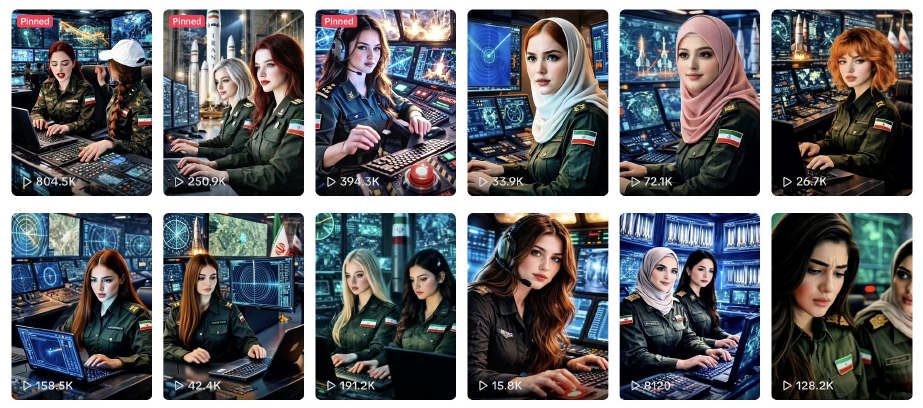 One key account exhibited a sleeper profile pattern: before the conflict, it had posted benign content featuring children, building a significant following. Once the conflict began, it pivoted abruptly to war-related content and generated 17 million views. A second account published seven videos, apparently from the same AI prompt, within a single minute on March 15, with inauthentic accounts then flooding the posts with coordinated comments to boost algorithmic visibility.