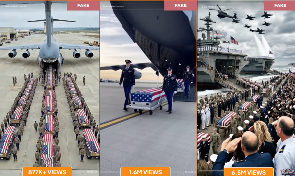 Each theme was engineered for emotional impact. The funeral procession videos reached up to 6.5 million views individually. The children’s grief videos, the most widely circulated of the three, featured identical dialogue and visual staging across dozens of accounts, strongly suggesting content produced from a small set of centralized prompts.