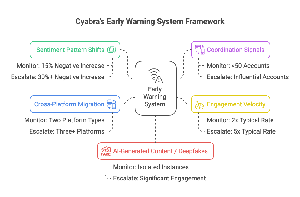 Cyabra’s framework provides structure for handling potential crisis signals. Establish specific thresholds for each warning sign: