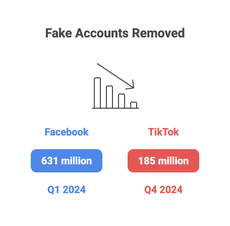 The primary obstacle isn’t platform indifference – it’s the sheer volume of reports they receive daily. According to recent data, Facebook removed approximately 631 million fake accounts in the first quarter of 2024 alone, a 48.1% increase from the previous year, TikTok removed approximately 185 million fake accounts in Q4 2024, along with six billion fake followers and seven million fake likes.