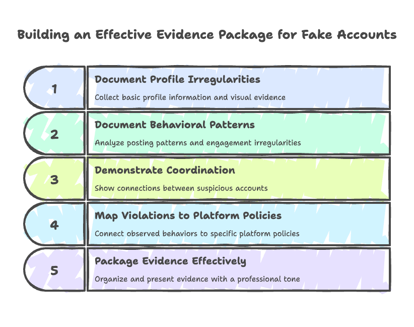 Properly documenting fake accounts requires a systematic approach to evidence collection and presentation. Here’s how to build a compelling case: