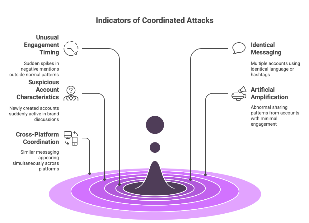 - Unusual Engagement Timing: Sudden spikes in negative mentions outside normal patterns, especially during off-hours.