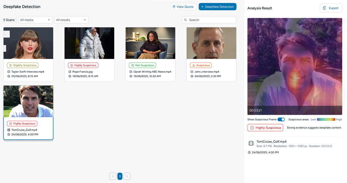 Powered by an advanced heatmap visualisation and spatio-temporal analysis, Cyabra’s advanced deepfake detection tool cuts through the most advanced AI-generated deception, analyzing images and videos with forensic precision and presenting the reasoning behind the analysis.